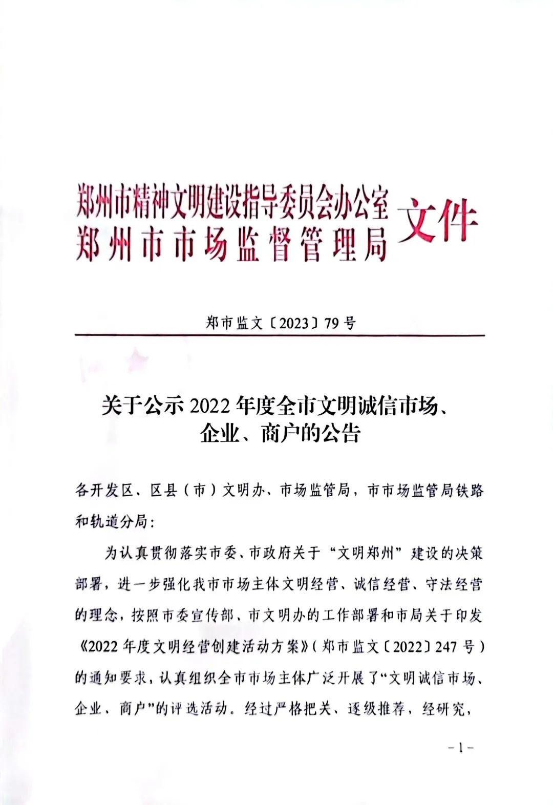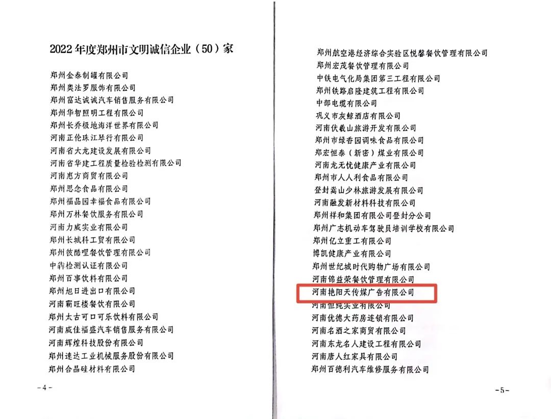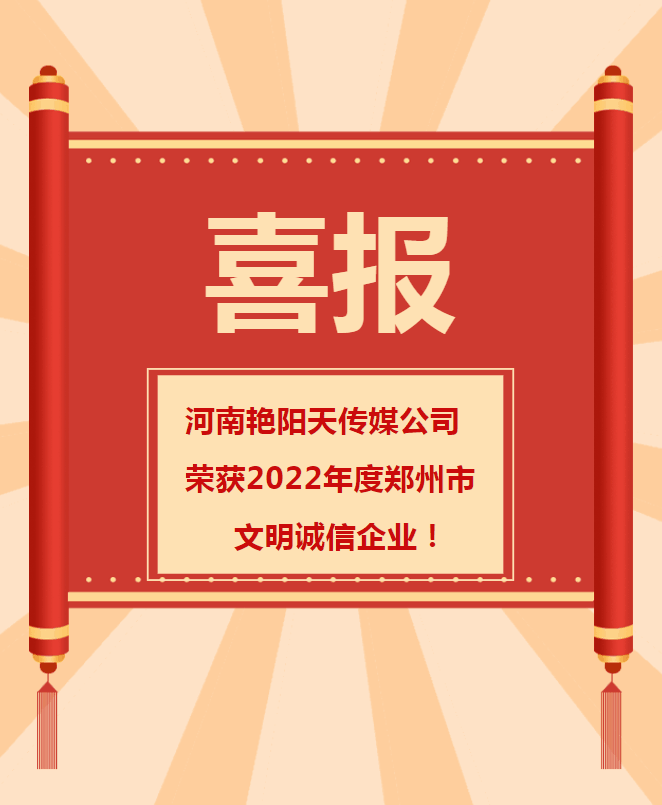 為認真貫徹落實市委、市政府關(guān)于“文明鄭州”建設(shè)的決策部署,進一步強化我市市場主體文明經(jīng)營、誠信經(jīng)營、守法經(jīng)營的理念,在鄭州市”文明誠信市場、企業(yè)、商戶“的評選活動中,河南艷陽天傳媒公司榮獲”2022年鄭州市文明誠信企業(yè)”榮譽稱號,成為了這一殊榮的榮獲者之一。